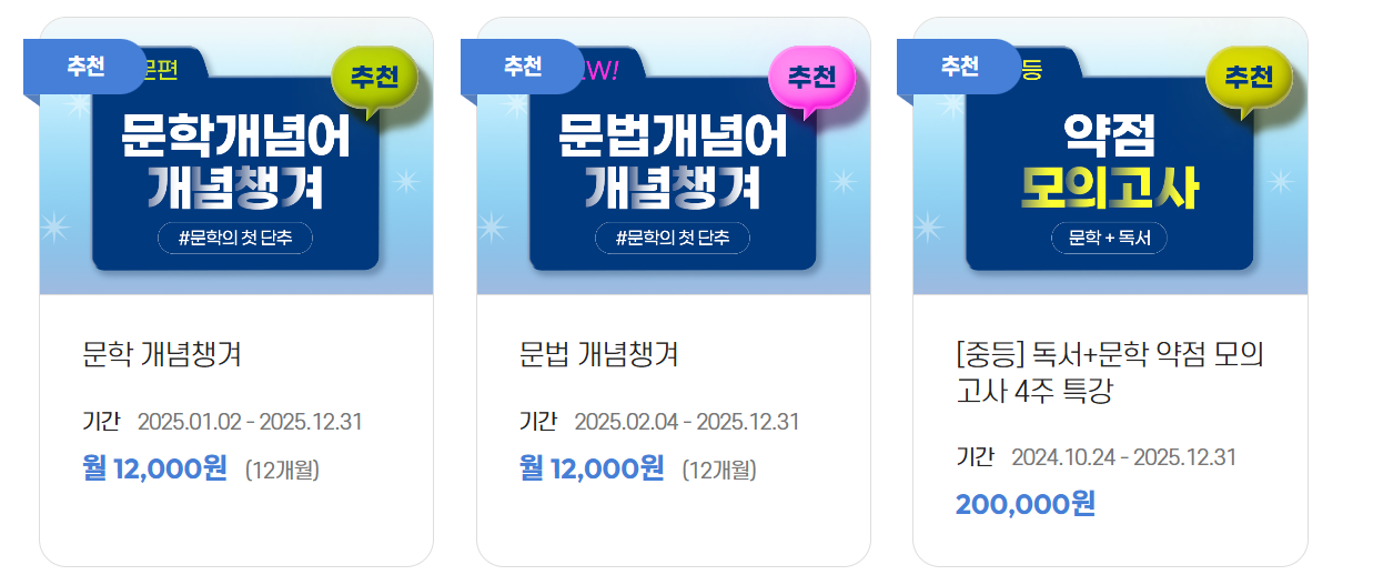 • 중등 : 처음 시작하는 문학, 독서, 문법 이론 + 문제 풀이 전반